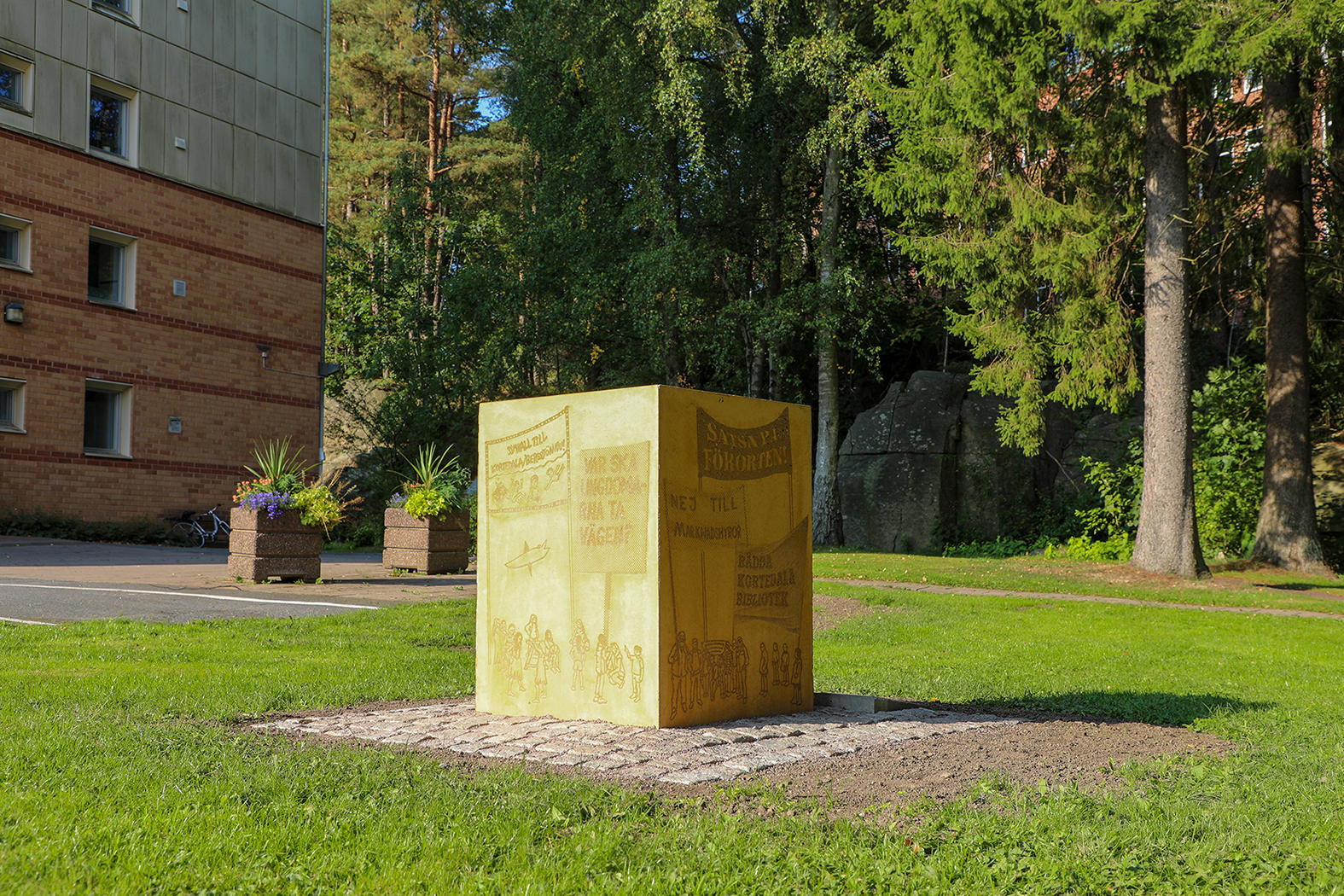 ”Historien börjar här” består av fyra betongmonument placerade längs ett gångstråk bakom höghusen på Kalendervägen 28–38.