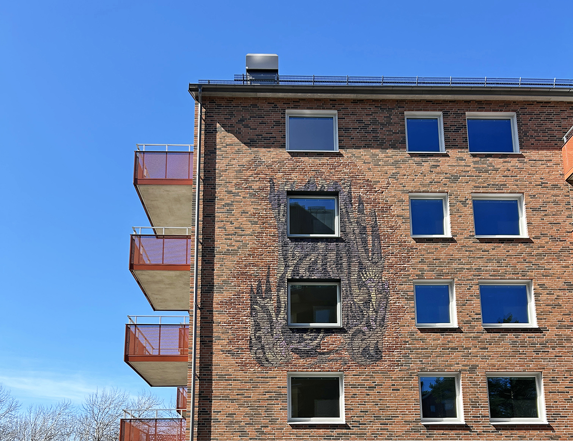 ”Risti” är av glaserat tegel som murats på markplan, i ögonhöjd för hyresgäster och andra som passerar huset i vardagen.